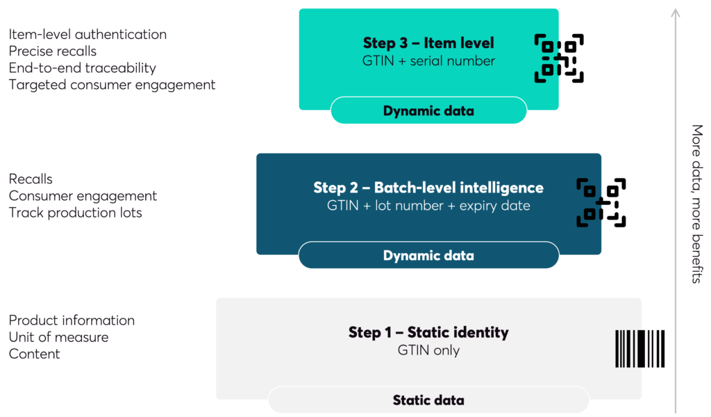 At this level, the barcode is a lookup tool. It serves the checkout and the warehouse — and little else. Some basic product attributes such as bulk or variable weight can be captured alongside the GTIN, but the data is fixed. It cannot tell you anything about the specific unit in front of you: which batch it came from, when it expires, whether it is genuine, or where it has been.